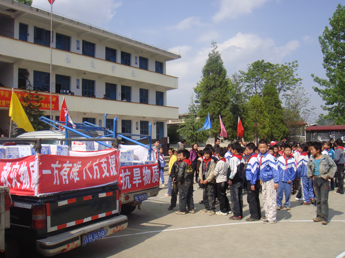 4月19日,由浙江永康群喜門業有限公司捐贈價值7000元的500件 1.2萬瓶“快樂王子”牌礦泉水,“搭”著五輛小型運輸車從我州興義市啟程,“奔赴”大旱災區的安龍縣興隆鎮巧凹小學,“滋潤”著學生的心田。