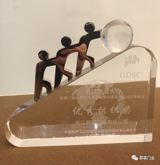 群喜門業(yè)專注為年輕人打造高品質的現(xiàn)代生活方式,原創(chuàng)設計,多年來公司始終采用德國夏特面板,堅守健康環(huán)保的理念。在此次大會上,群喜門業(yè)不負眾望,在數(shù)百名行業(yè)大咖及1000多名企業(yè)代表的見證下,榮獲了“優(yōu)秀組織獎”。