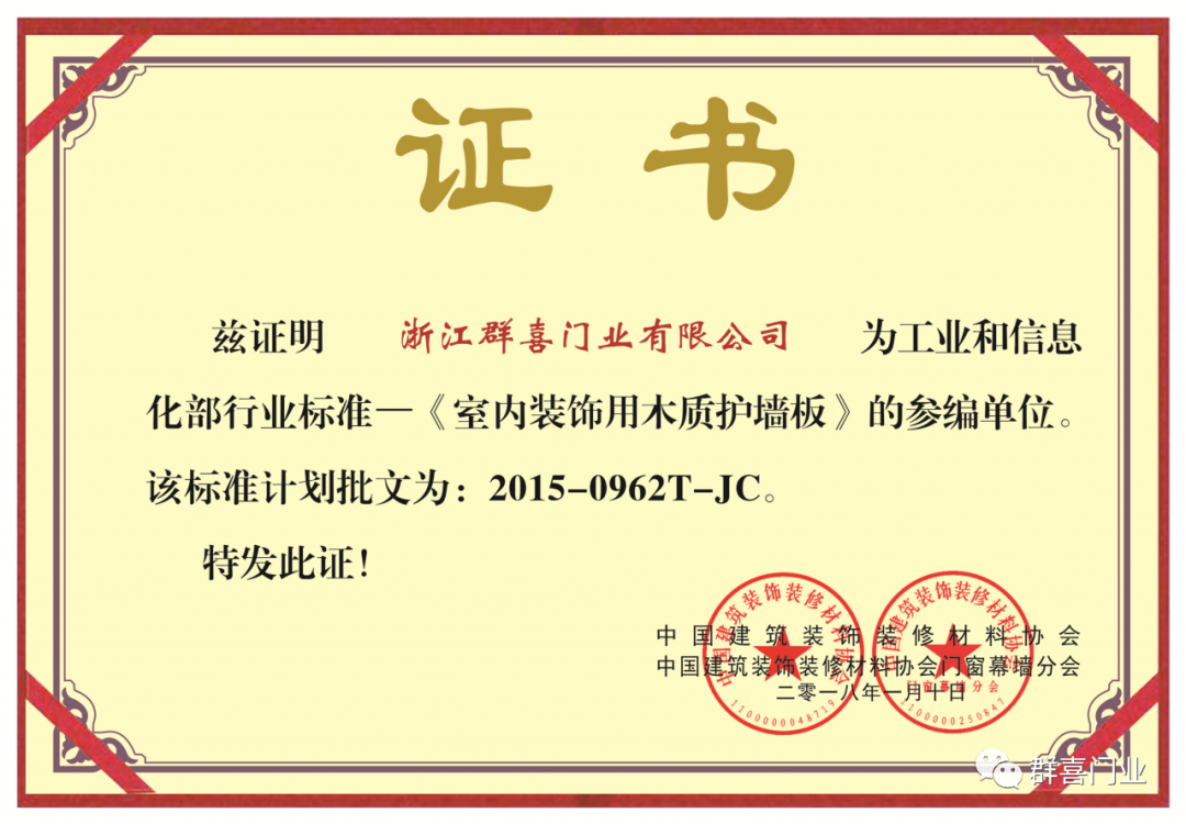 群喜門(mén)業(yè)以高品質(zhì)產(chǎn)品和服務(wù)為企業(yè)發(fā)展之根基,從創(chuàng)立之初起就以高標(biāo)準(zhǔn)高規(guī)格來(lái)嚴(yán)格要求自身,同時(shí)也積極參與行業(yè)標(biāo)準(zhǔn)的規(guī)范化,推進(jìn)行業(yè)健康有序發(fā)展。本次榮幸參與《室內(nèi)裝飾用木質(zhì)護(hù)墻板》的標(biāo)準(zhǔn)制訂工作,充分肯定了群喜木門(mén)在產(chǎn)品生產(chǎn)安裝服務(wù)規(guī)范方面的示范與成果,再次履行了推動(dòng)行業(yè)健康發(fā)展的企業(yè)責(zé)任。