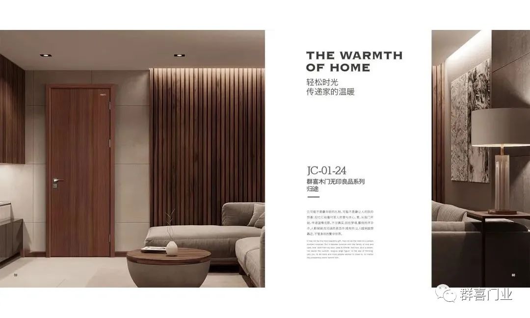 群喜木門,愿將環保健康帶進每個家庭,將一個家裝點出賞心悅目的顏色,用清新無味的空間釀造家的悠長回味,將城市喧囂的聲音緩沖成和諧的旋律。