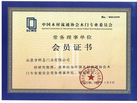 經過中國木材流通協會和木材市場專業委員會層層考核,并在2007年9月27日中國木材流通協會木門專業委員會會長張國林、秘書長王永林等領導親自到永康市群喜門業有限公司視察,終于獲得常務理事單位的名額。