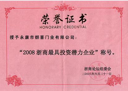 永康市群喜門業(yè)有限公司經(jīng)過層層評選,最終獲得“2008浙商最具投資潛力企業(yè)”,他們對群喜公司的評價是:1.未上市,2.有獨特的商業(yè)模式、壟斷技術或其他核心競爭力,在未來三年內(nèi),預計銷售收入年平均增長不低于30%,這是對群喜公司發(fā)展的又一肯定。