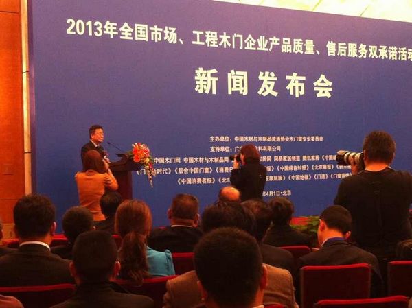 2013年4月1日,“2013年全國市場、工程木門企業(yè)產(chǎn)品質(zhì)量、售后服務(wù)雙承諾活動”新聞發(fā)布會在北京人民大會堂召開。商務(wù)部、工信部、民政部、國資委、中國物流與采購聯(lián)合會、中國建筑裝飾協(xié)會住宅裝飾裝修委員會、住建部標準委、中國消費者協(xié)會、家居大賣場以及行業(yè)協(xié)會領(lǐng)導(dǎo)應(yīng)邀出席了會議,參加會議的還有企業(yè)家代表、主流媒體等代表,群喜門業(yè)總經(jīng)理單澤喜受邀參加了2013年全國市場、工程木門企業(yè)產(chǎn)品質(zhì)量、售后服務(wù)雙承諾活動。