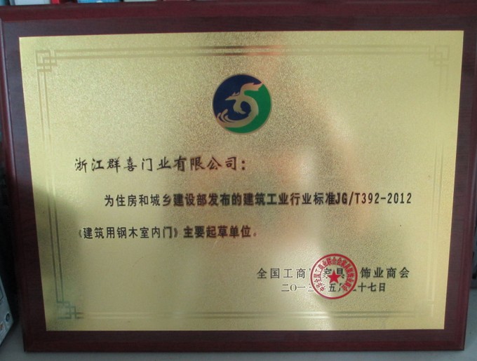 作為全國工商聯家具裝飾業商會鋼木門專委會的理事單位、鋼木門行業國標重要起草單位之一,浙江群喜門業有限公司在生產鋼木門方面達到了專業化。例如鋼木門鋼板厚度只有達到0.5mm或以上才能起到防撞擊的安全規格等評審指標,為國標參考提供了大量可靠數據。目前,全國鋼木門年產值已達50億元,占室內門市場總值的1/3,行業年產值以40%的驚人速度增長,有專家稱,我國鋼木門行業未來市場空間廣闊。鋼木門是中國居室門行業的后起之秀,近幾年來以其低碳環保、無毒無味的產品特點受到廣大消費者的認可,一直以來市場終端反響良好 。