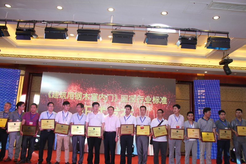 【中國門都網訊】5月27日,在2013年全國工商聯鋼木門專委會年會現場,《建筑用鋼木室內門》標準正式發布。作為標準制定的企業之一,群喜門業代表單澤喜拿到了由協會發布的參編企業獎牌。
