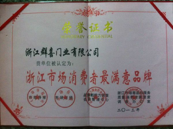 熱烈祝賀浙江群喜門業有限公司于2013年8月被認定為浙江市場消費者最滿意品牌。