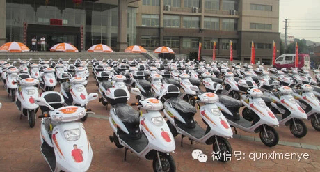 白色的電動車排成了一個方陣,四周插上群喜門業的彩旗,車上還獨家粘貼了群喜代言人相聲大師李金斗的代言肖像,這車開在路上,包管回頭率百分百。