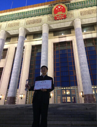 群喜門業總經理單澤喜在人民大會堂前合影留念