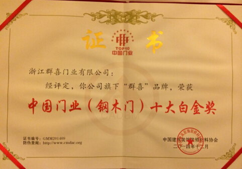 在所有群喜家人的努力下群喜門業喜獲中國門業十大品牌白金獎