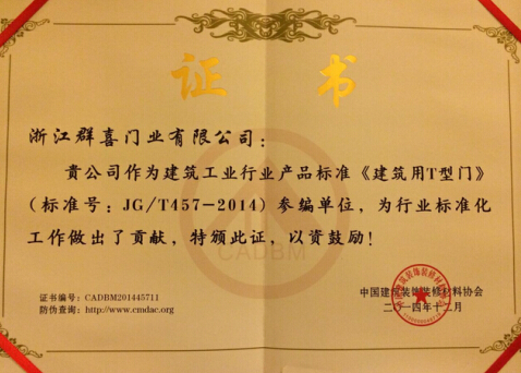 隨后,中國建筑裝飾裝修材料協會和中國標準化研究院共同授予群喜門業(建筑用T型門)國家標準參編證書