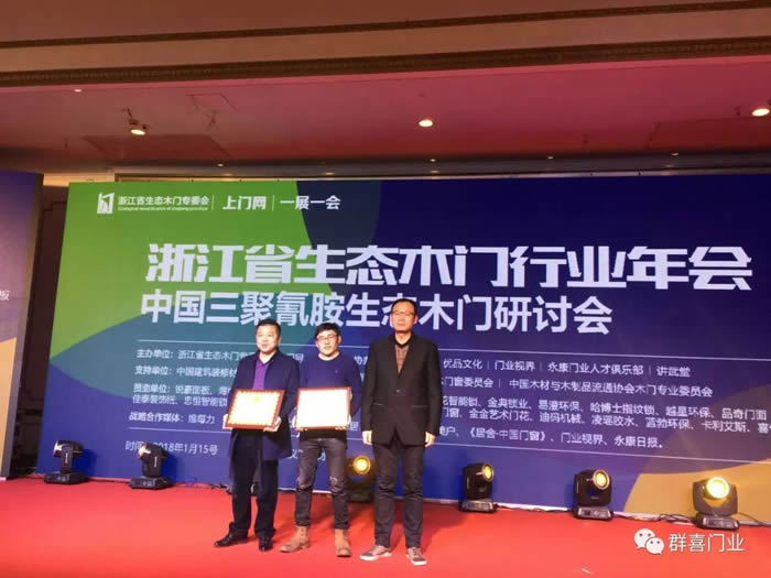 2018年1月15日,第二屆中國門業(yè)互聯(lián)網(wǎng)大會暨浙江省生態(tài)木門行業(yè)年會在武義清水灣隆重舉行。相關(guān)門業(yè)協(xié)會領(lǐng)導(dǎo)、全國知名木門企業(yè)家、營銷總監(jiān)、房地產(chǎn)商、上下游供應(yīng)商、裝飾公司、設(shè)計師等代表共聚一堂,共商行業(yè)發(fā)展大計。 會上表彰了在過去一年中,在生態(tài)木門行業(yè)起到帶頭作用的優(yōu)秀門業(yè)企業(yè)的集體和個人,并對其進行頒獎。群喜門業(yè)有幸參與且榮獲“2017年度設(shè)計創(chuàng)新獎”,實至名歸,得此殊榮也是對群喜門業(yè)的最高肯定! ▲【群喜門業(yè)榮獲2017年度設(shè)計創(chuàng)新獎】 時光荏苒,初心不改 群喜門業(yè)自成立以來,始終保持著創(chuàng)立初衷,致力讓中國制造門業(yè)品牌為世人接受,堅持立足品質(zhì),長遠發(fā)展,引領(lǐng)行業(yè)進步。致力于品質(zhì)、渠道、品牌、服務(wù)等全方位的創(chuàng)新與提升,并順應(yīng)時代發(fā)展的要求,傾力為社會創(chuàng)造高品質(zhì)的產(chǎn)品和服務(wù),促進行業(yè)共同發(fā)展。相信在中國門業(yè)市場,因為有群喜門業(yè)的存在,而變得更加精彩。 設(shè)計領(lǐng)先,設(shè)計驅(qū)動 群喜木門聘請意大利著名設(shè)計師專業(yè)設(shè)計,更符合當(dāng)下的流行趨勢和潮流,采用進口材料和工藝,把唯美的木門產(chǎn)品貢獻給廣大消費者,為你的居家生活增添色彩。 隨著室內(nèi)設(shè)計逐漸成為家庭裝修不可或缺的重要環(huán)節(jié),家裝產(chǎn)品如何能夠滿足消費者天馬行空的設(shè)計思路就成為了企業(yè)發(fā)展的重點。木門作為家裝空間中最能體現(xiàn)整體裝修風(fēng)格的元素所在,其設(shè)計思路自然就成為了居室環(huán)境能否實現(xiàn)整體性的關(guān)鍵所在。 追求卓越,精益求精 此次獲得2017年度設(shè)計創(chuàng)新獎是廣大消費者及社會各界對群喜門業(yè)的肯定和激勵,2018年我們將更注重環(huán)保,質(zhì)量,款式,不忘初心、砥礪前行,用更優(yōu)秀的產(chǎn)品、更優(yōu)質(zhì)的服務(wù)以及更堅定的信心回報廣大消費者,做讓消費者更信賴的品牌。 ▲群喜門業(yè)單總和中國木門協(xié)會張國林會長,中國建筑幕墻門窗協(xié)會潘冠軍主任,中國建筑裝飾材料協(xié)會門窗分會丁輝秘書長,王力門業(yè)鄭鋼,鑫六福盧總在一起 榮譽是一座豐碑,也是一個新的起點。此次能夠獲此殊榮,是對群喜門業(yè)的最大肯定,也是對每一位群喜人多年來持之以恒、默默付出的最美好的見證!未來,相信在單總的帶領(lǐng),及全體員工的努力下,群喜定會更上一層樓,創(chuàng)造更美好的明天!